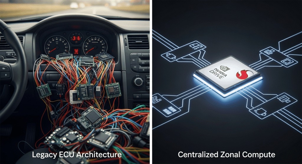 To grasp the scale of this battle, one must first appreciate the architectural revolution. A traditional car contains a sprawling, decentralized network of 80 to 150 individual Electronic Control Units (ECUs). This creates a complex, heavy, and inflexible “spaghetti” of wiring that is impossible to update meaningfully over the air.